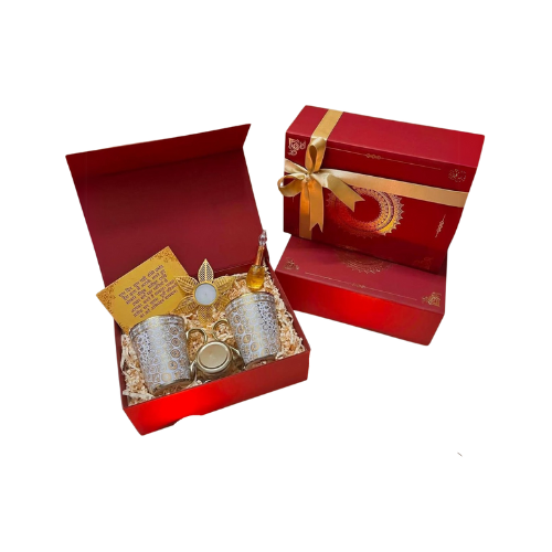 Wrapped in a luxurious red box adorned with a golden ribbon, the Golden Radiance Gift Box is a celebration of elegance, tradition and warmth A pair of intricately designed gold & silver mugs, perfect for cozy moments A shimmering floral metal diya to light up hearts and homes- 1 pc A jar of premium silver fennel – a touch of tradition and taste A delicate bottle of Parag’s Champa Attar, adding a divine fragrance to every occasion A heartfelt Thank You card, sharing your warmest wishes