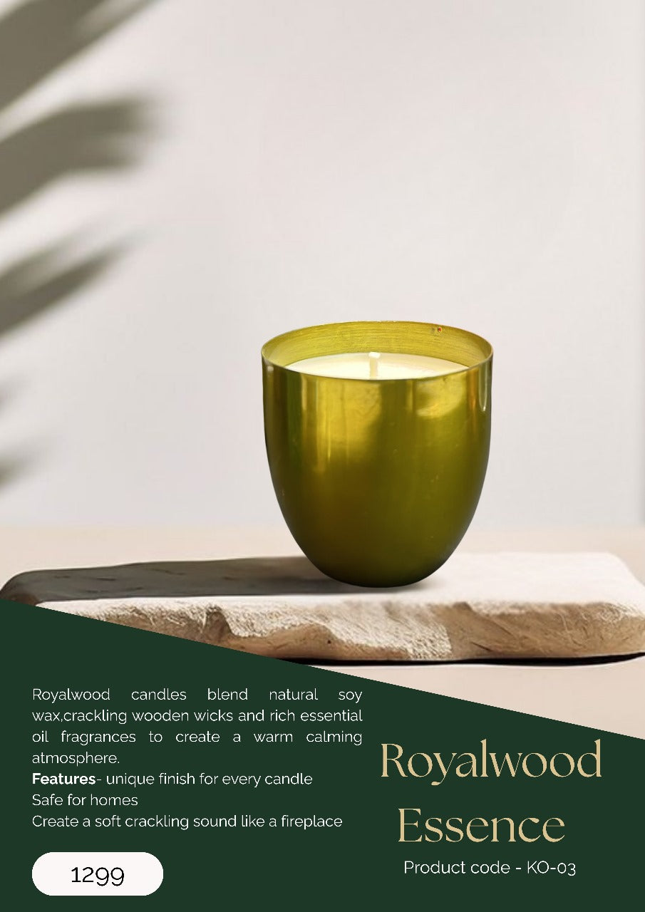Indulge your senses with the Royalwood Essence, where timeless elegance meets modern serenity. Crafted from premium natural soy wax, this candle is housed in a sleek olive-gold vessel that exudes opulence and blends seamlessly with both contemporary and classic décor.